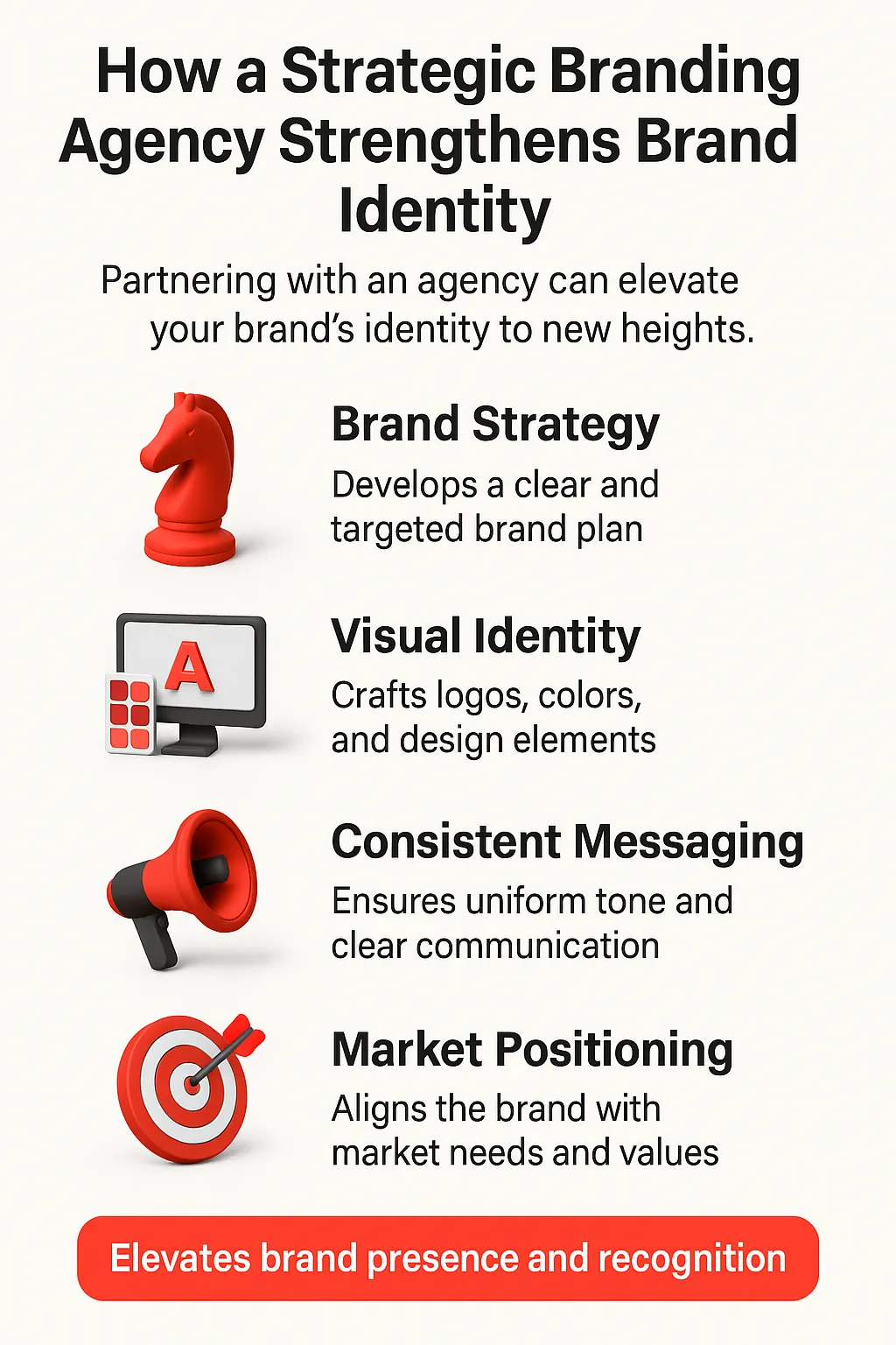 A strategic branding agency strengthens identity by looking beyond visuals. It studies the market, analyzes competitors, and listens to customer needs. This research becomes the foundation for a brand framework that guides not only design but also voice, messaging, and customer experience.